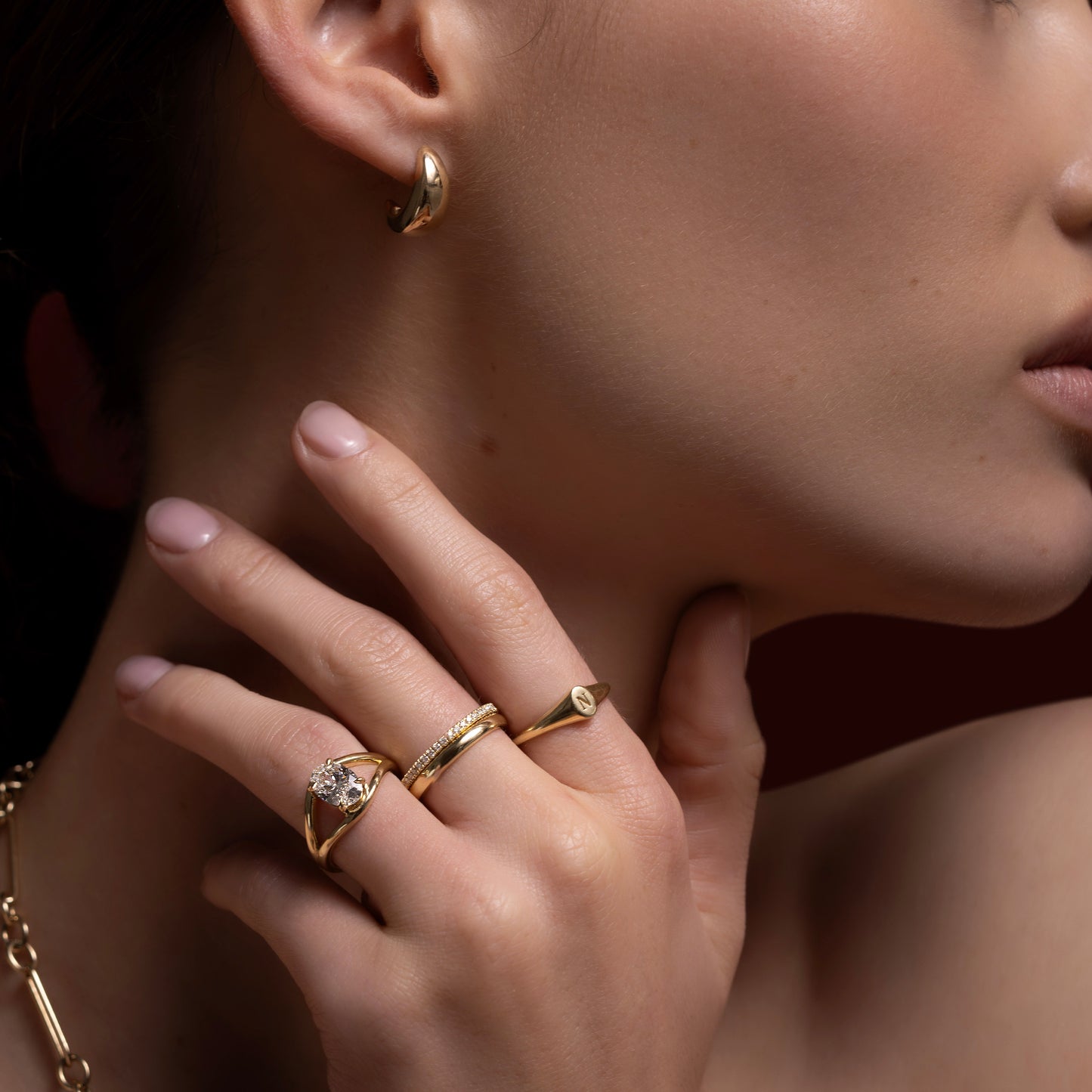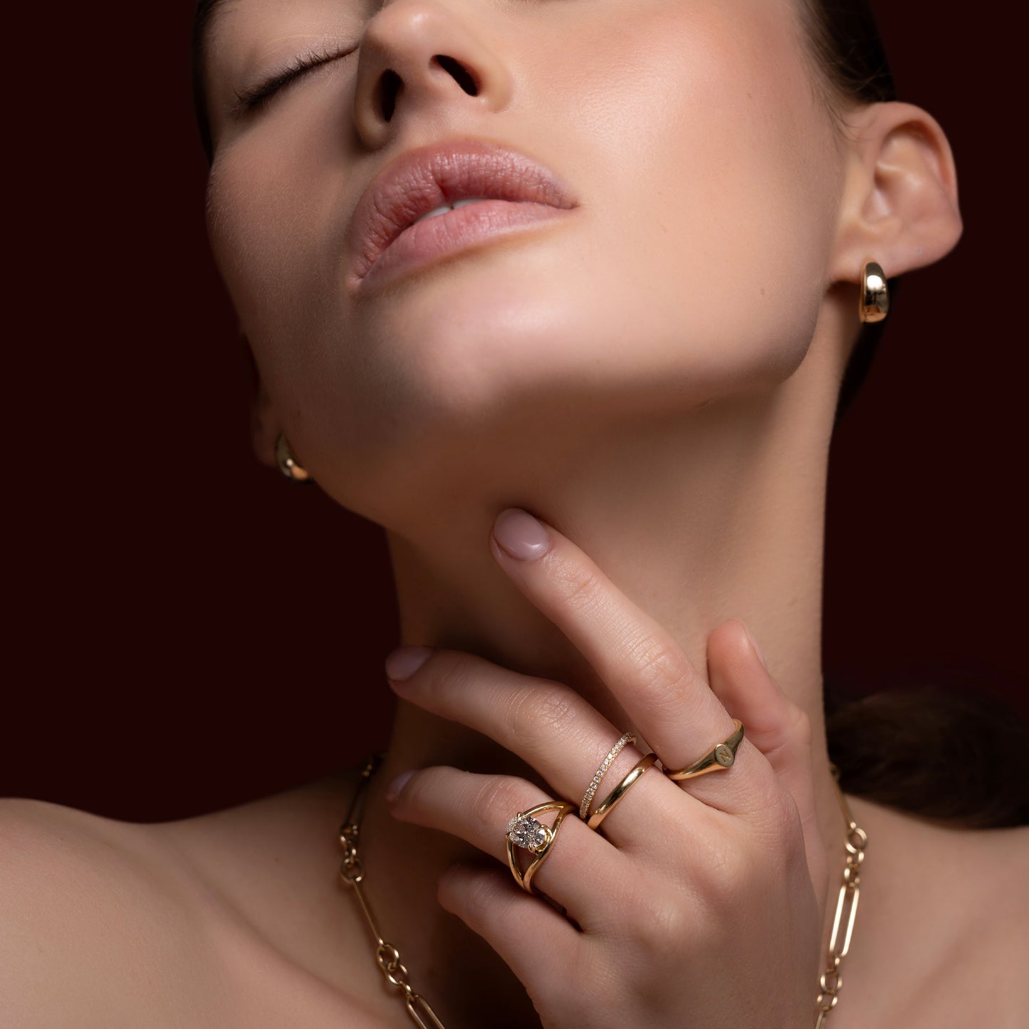 A poised and timeless statement of strength and unwavering love. The Elise Ring features an oval cut lab-grown gemstone, suspended between an elegantly curved split shank.