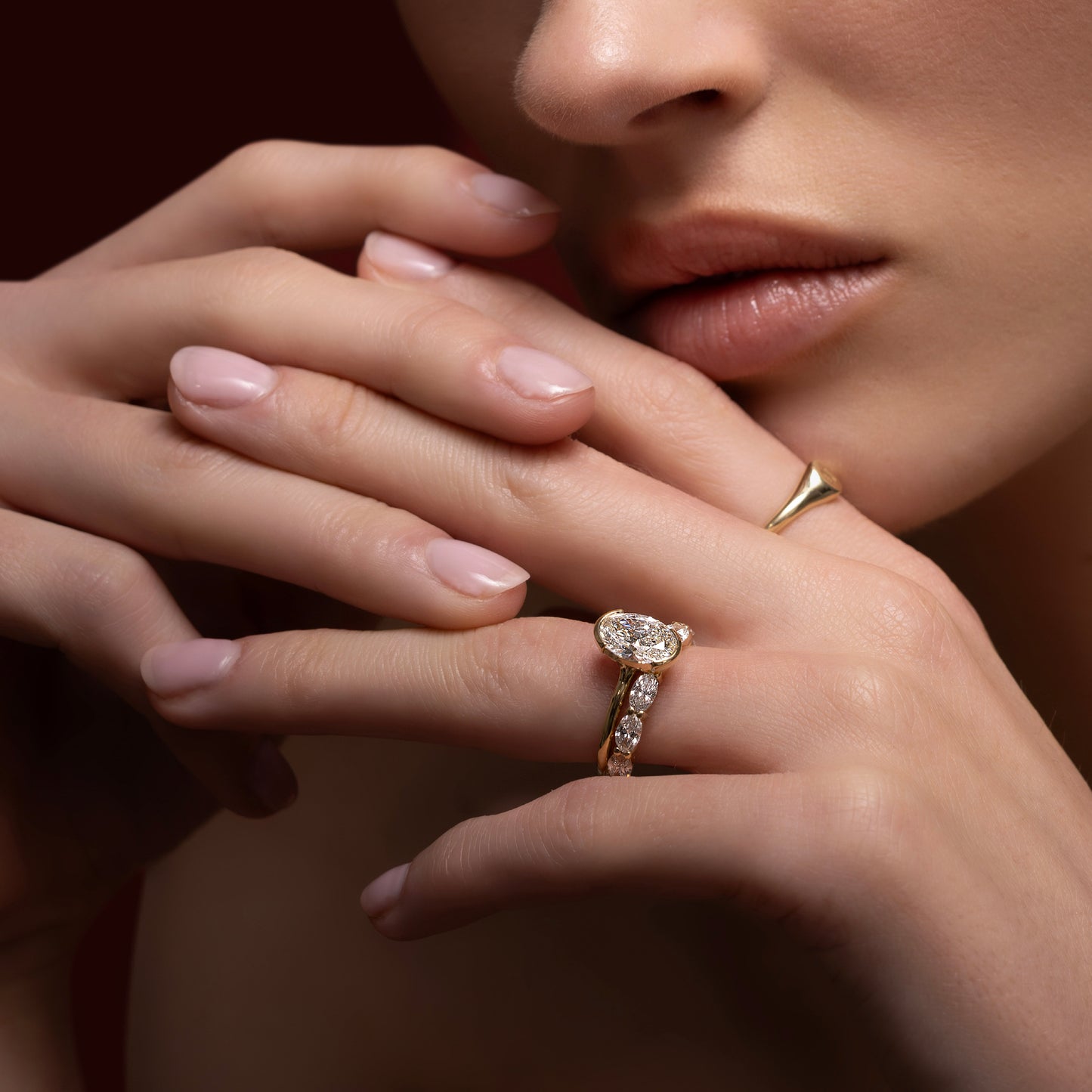Our Signature Half Bezel Setting cradles an oval lab-grown gemstone on either side, offering a modern, streamlined silhouette. A hidden gallery rail beneath the setting ensures strength and support while maintaining the refined, floating appearance of a true half bezel when viewed from above.