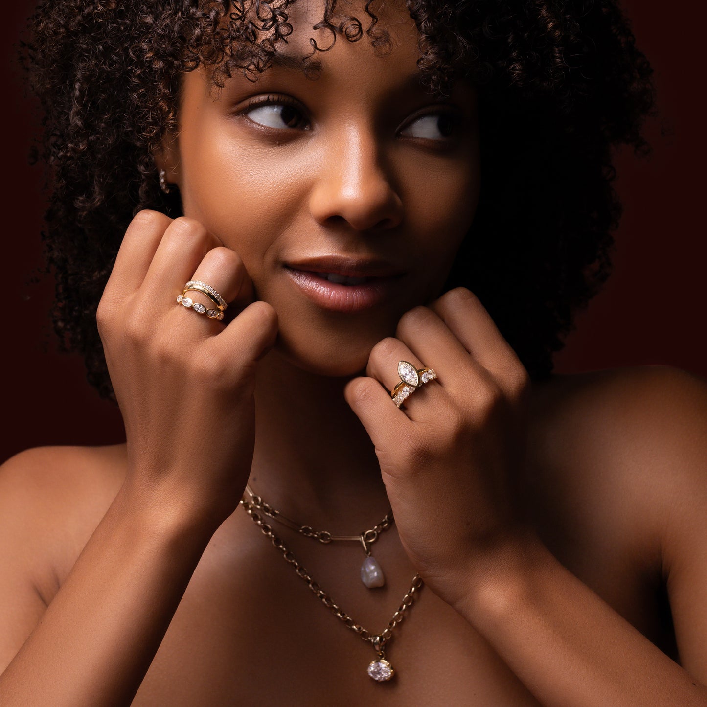 Pictured: The Arie Ring is styled with The Saphira Ring - Slanted Marquise Ceremonial Ring.