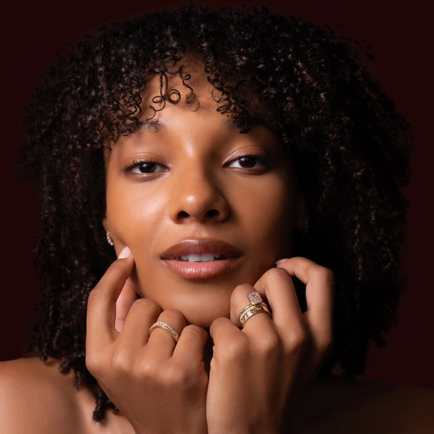 Pictured: The Audrey Ring is styled with The Lira Ring - Inset Statement Ceremonial Ring and The Ava Ring - Pavé Wedding Band (image one), The Classic Statement Ring (image one), and The Noemie Ring - Baguette Wedding Band (image three).
