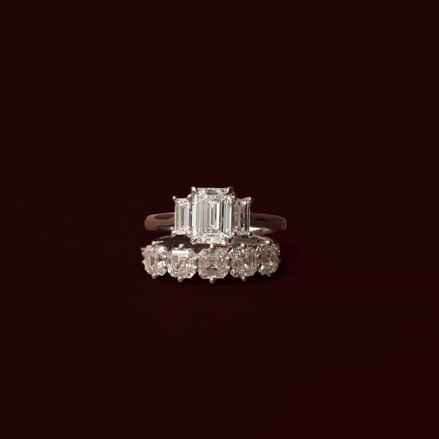 An exquisite array of Asscher cut gemstones to adorn your left hand. The Maeva Ring Asscher Wedding Band is a modern ceremonial design, that has an old-world charm with its 4mm asscher cuts central to the striking design.